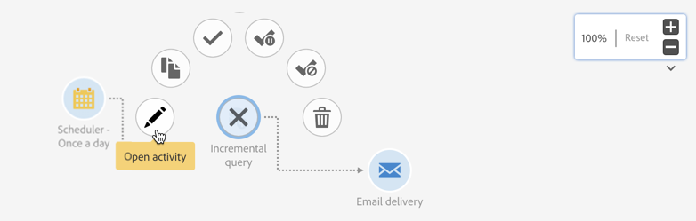 활동을 선택하면 활동 주위에 빠른 작업 버튼이 표시되어 활동을 상호 작용할 수 있습니다.