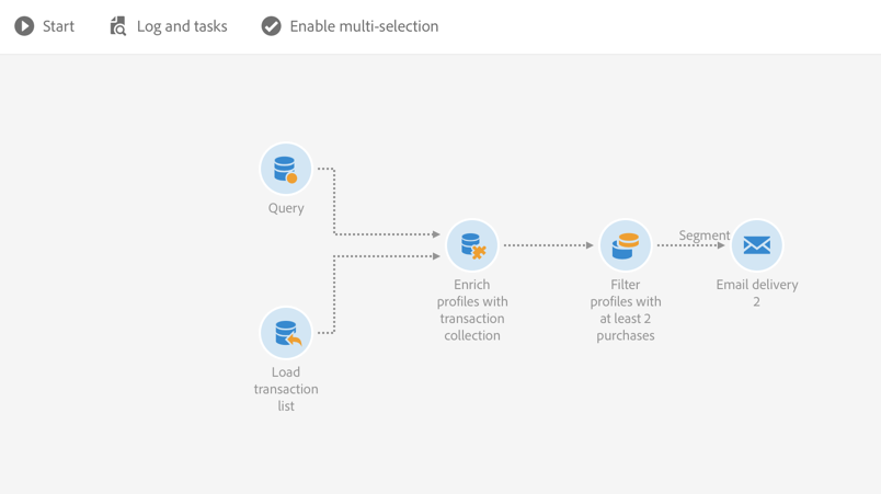 이 예에서는 파일에 포함된 구매 데이터를 사용하여 프로필 데이터를 보강하는 방법을 보여줍니다.구매 데이터는 서드파티 시스템에 저장되어 있다고 가정합니다. 각 프로필 파일에 여러 개의 구매를 저장할 수 있습니다. 워크플로우의 최종 목표는 두 개 이상의 항목을 구매한 대상 프로필로 전자 메일을 보내 충성도에 대한 감사를 표시하는 것입니다.