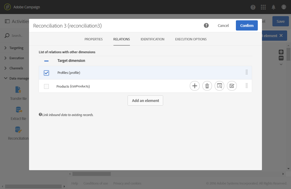 A 조정 활동은 구매 데이터를 데이터베이스 프로필과 제품에 연결합니다. 따라서 파일 데이터와 프로필 표 및 제품 표 간의 관계를 정의해야 합니다. 해당 활동의 Relations 탭에서 이 구성을 수행합니다.