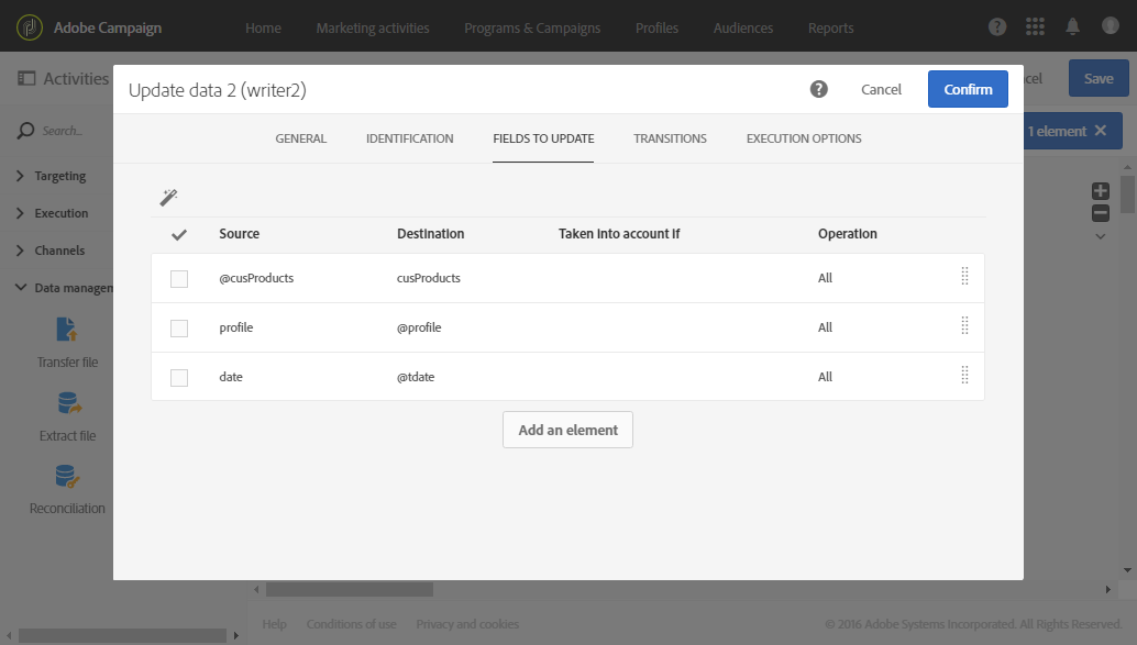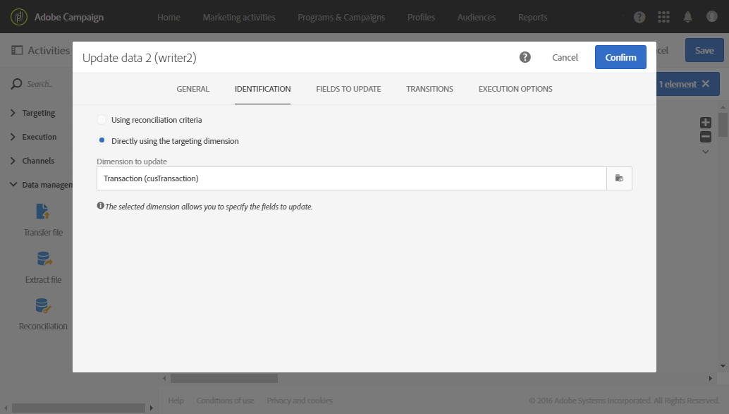 An 데이터 업데이트 가져온 데이터를 사용하여 업데이트할 데이터베이스 필드를 활동을 통해 정의할 수 있습니다. 앞선 활동에서 데이터가 이미 트랜잭션 차원에 속하는 것으로 식별되었으므로, Directly using the targeting dimension 식별 옵션을 사용할 수 있습니다.