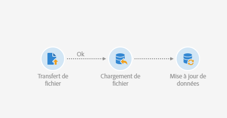 L'exemple suivant montre le résultat d'une activité de chargement d'un fichier automatiquement téléchargé via une activité de transfert, suivie d'une mise à jour de données. Le but de ce workflow est d'enrichir la base Adobe Campaign avec de nouveaux profils ou de mettre à jour les profils existants à partir des données récupérées dans le fichier importé.