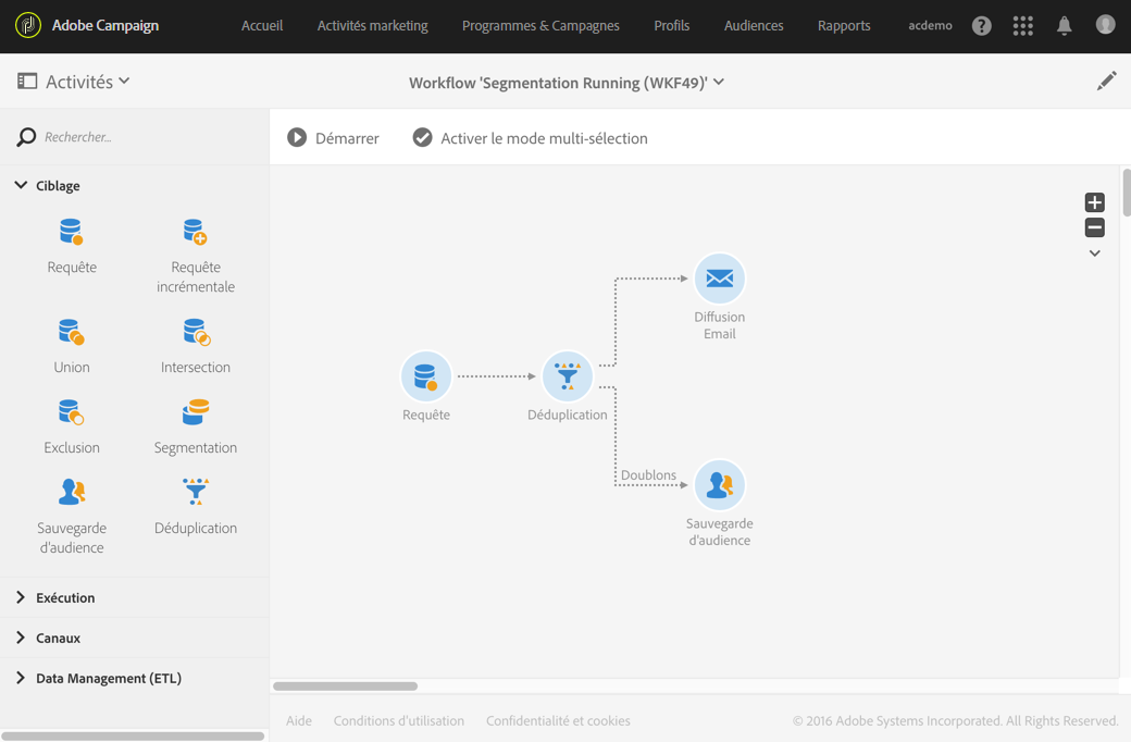 L'exemple suivant illustre une déduplication permettant d'exclure les doublons d'une cible avant l'envoi d'un email. Cela permet d'éviter d'envoyer une communication plusieurs fois à un même profil.