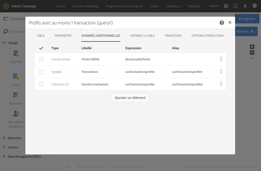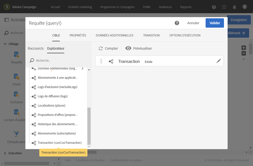 Ajoutez une activité de Requête permettant de cibler les profils ayant effectué au moins une transaction.