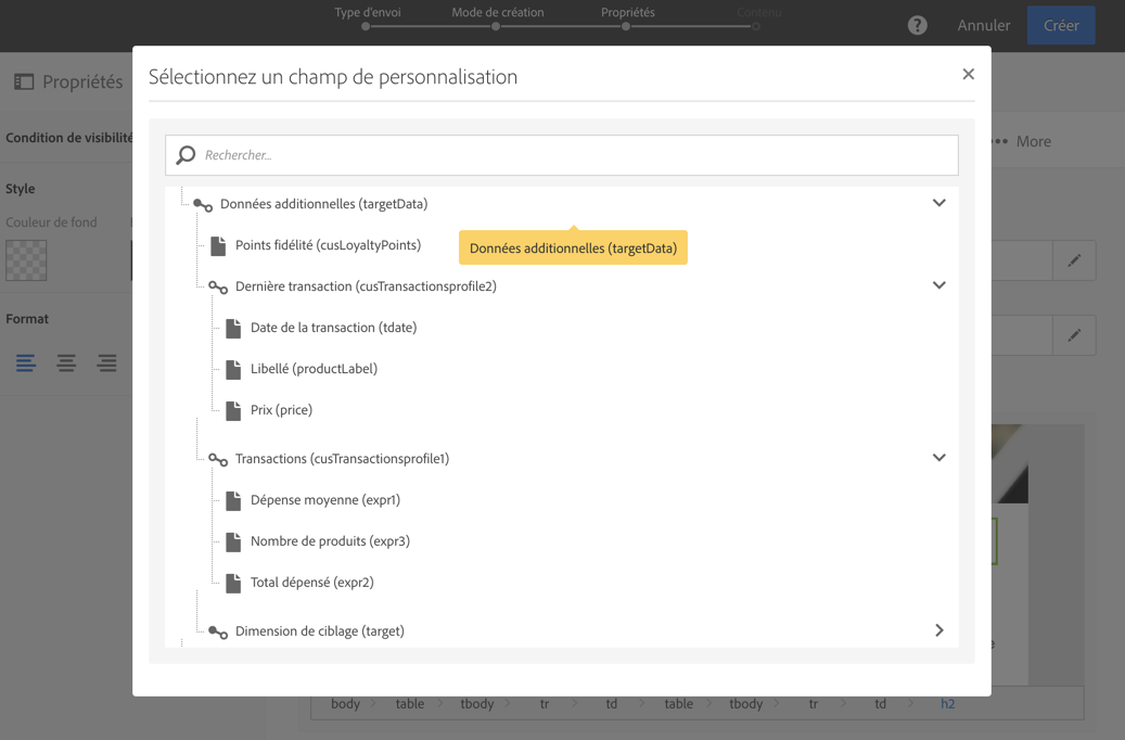 Ajoutez une activité Diffusion Email. Dans le contenu de l’email, insérez les champs de personnalisation correspondant aux données calculées dans la requête. Vous pouvez les retrouver via le lien Données additionnelles (targetData) de l’explorateur des champs de personnalisation.
