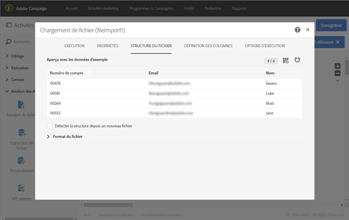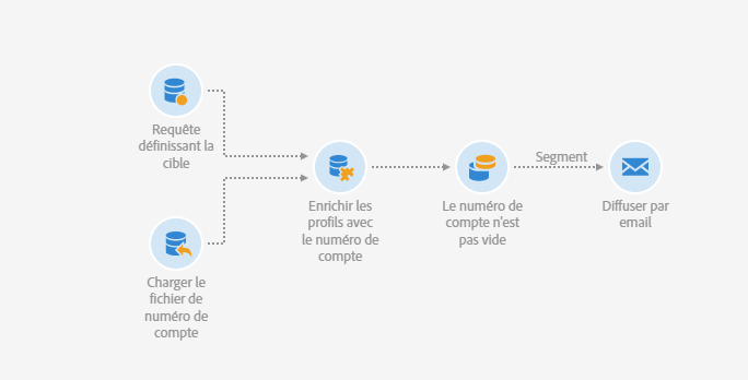 L'exemple ci-dessous montre comment envoyer un email enrichi avec des données additionnelles extraites d'un fichier externe par le biais de l'activité Chargement de fichier. Dans cet exemple, le fichier externe contient une liste de profils avec leur numéro de compte associé. Vous souhaitez importer ces données pour envoyer un email à chaque profil avec son numéro de compte.