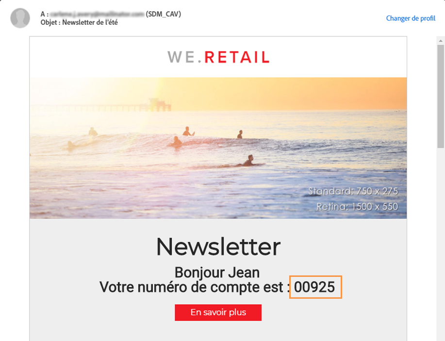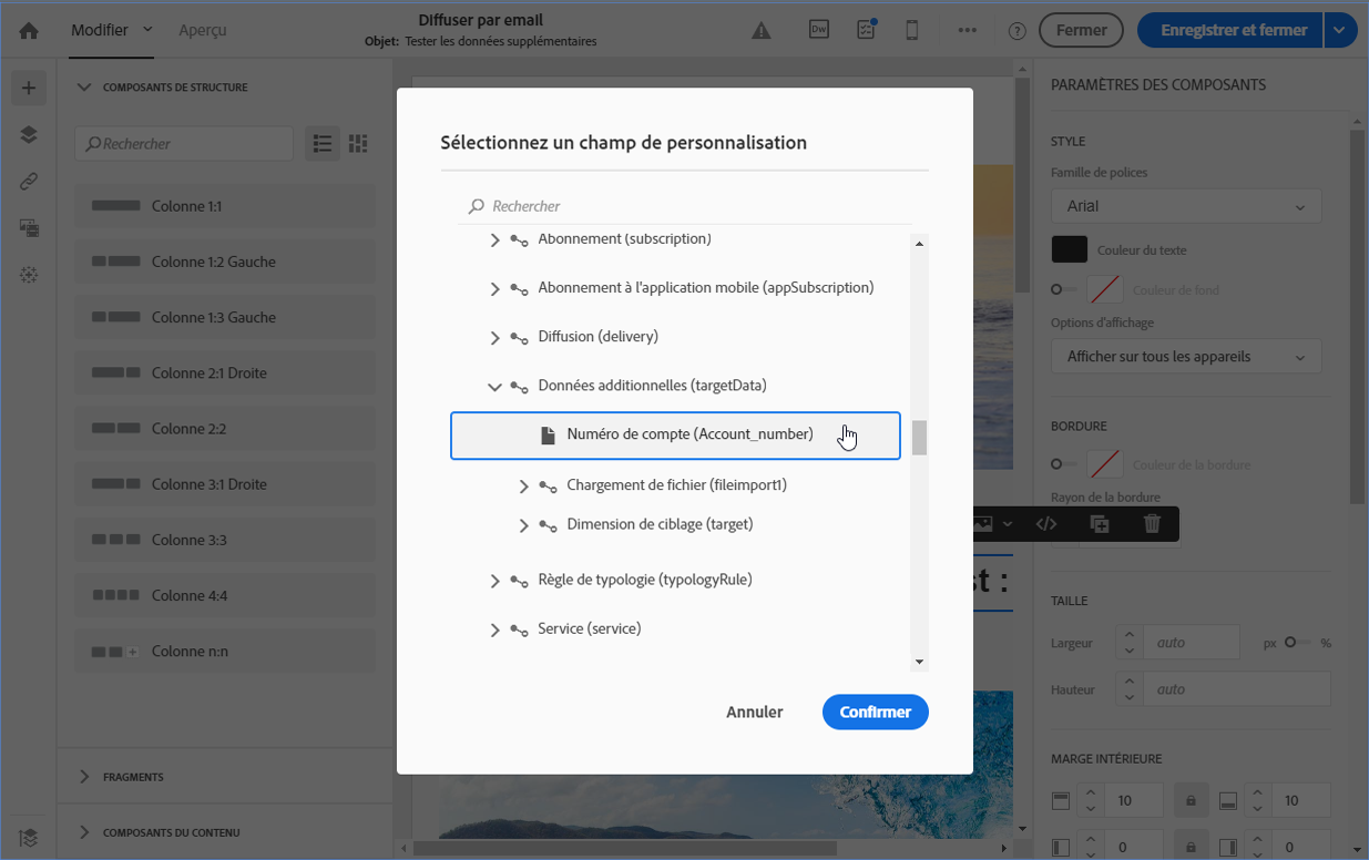 Ajoutez un champ de personnalisation et sélectionnez les données additionnelles définies dans l'activité Enrichissement (ici, le numéro de compte) du nœud Données additionnelles (targetData). Vous pouvez ainsi récupérer dynamiquement le numéro de compte de chaque profil dans le contenu de l'email.