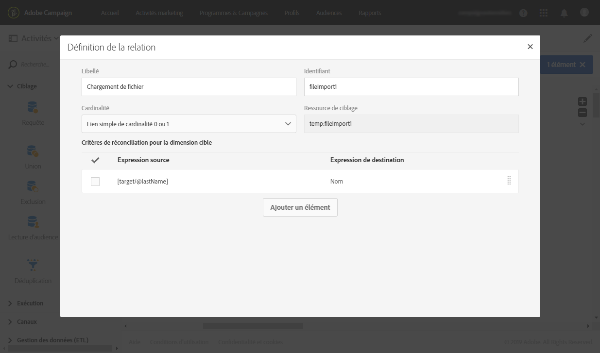 Dans l'onglet Relations avancées de l'activité Enrichissement, sélectionnez le Lien simple de cardinalité 0 ou 1 et définissez les champs à utiliser pour la réconciliation. Nous utilisons ici le nom de famille pour réconcilier les données avec les profils de base de données.