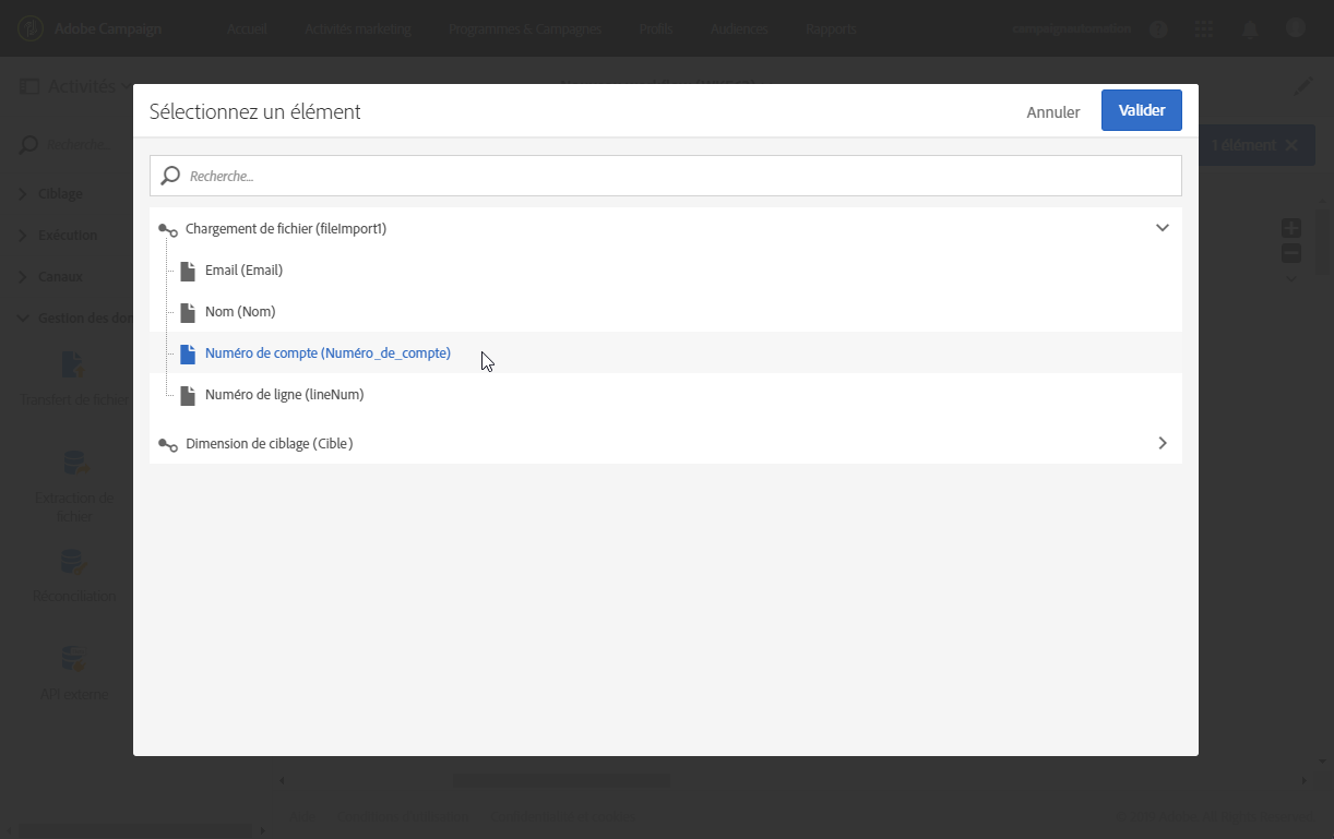 Dans l'onglet Données additionnelles, sélectionnez les éléments à utiliser dans votre email. Sélectionnez ici le numéro de compte (colonne du fichier que vous avez récupéré via l'activité Chargement de fichier).