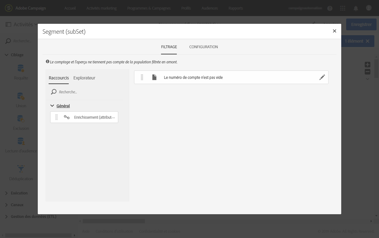 Placez une activité Segmentation dans votre workflow et ouvrez-la pour affiner la cible principale.