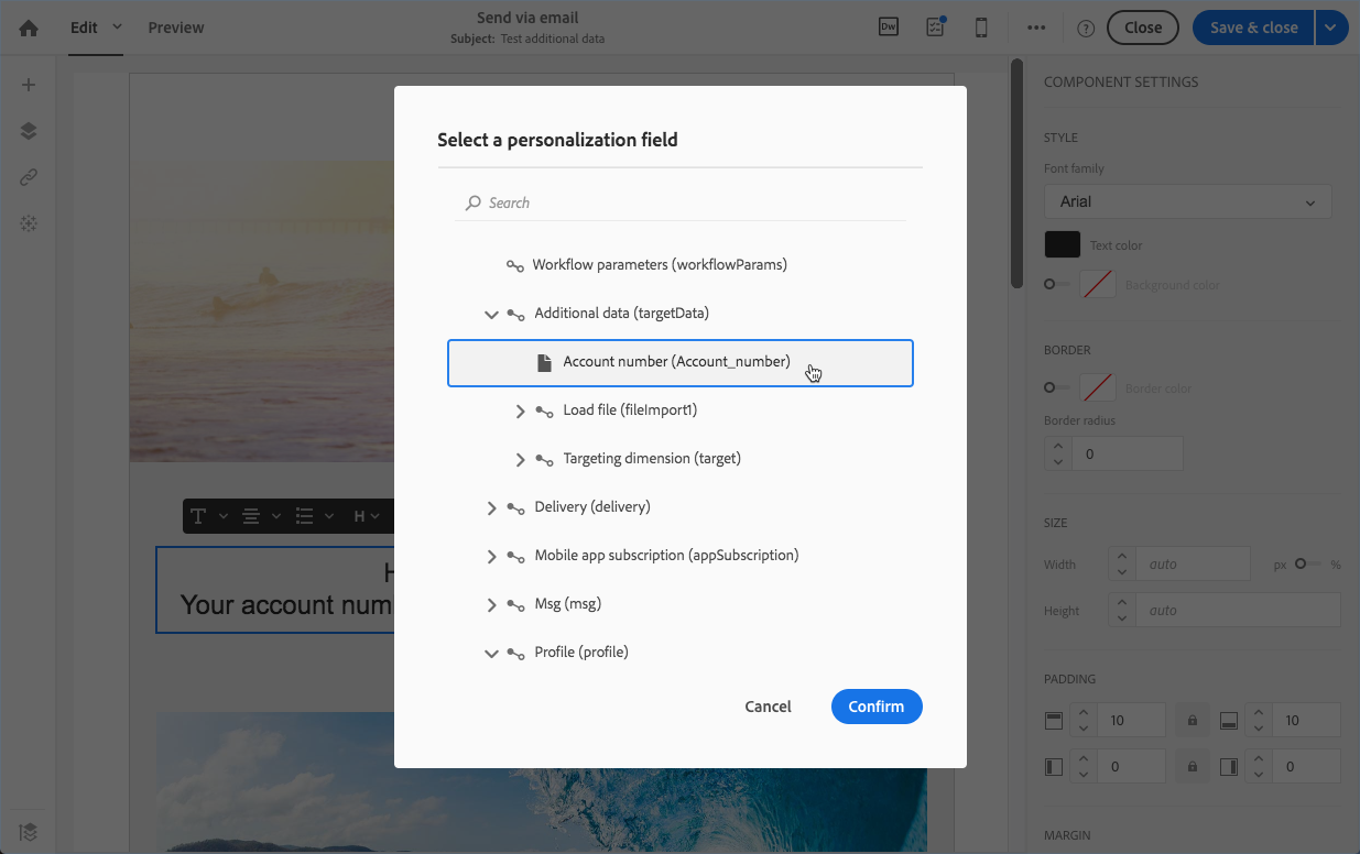 개인화 필드를 추가하고 Additional data (targetData) 노드에서 데이터 보강 활동에 정의된 추가 데이터(이 경우 계좌 번호)를 선택합니다. 이를 통해 이메일 콘텐츠에서 각 프로필의 계좌 번호를 다이내믹하게 가져올 수 있습니다.