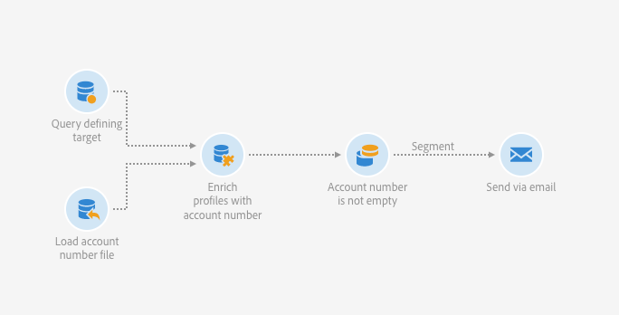아래 예제는 파일 로드 활동을 통해 외부 파일에서 검색한 추가 데이터를 사용하여 이메일을 보내는 방법을 보여 줍니다. 이 예제에서 외부 파일에는 프로필 목록과 해당 프로필의 계좌 번호가 들어 있습니다. 이 데이터를 가져와서 각 프로필에 계좌 번호가 포함된 이메일을 보내려고 합니다.