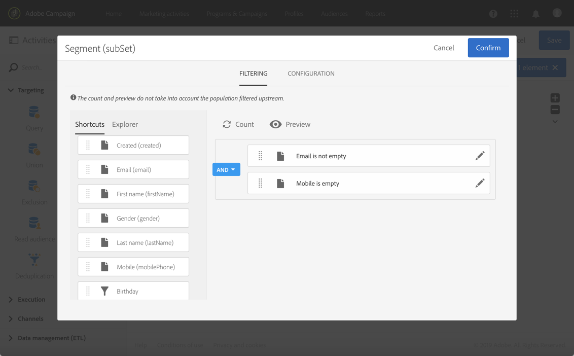 쿼리 활동에서 타겟을 식별한 후에는 이메일과 문자 메시지를 받는 대상을 두 개의 다른 모집단으로 세분화하는 조건을 선택해야 합니다.