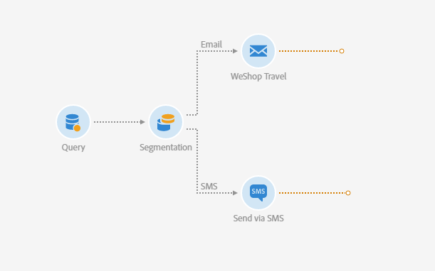 워크플로우가 시작되면, Query 활동은 세그먼트화되어 이메일 또는 SMS 게재를 받습니다.
