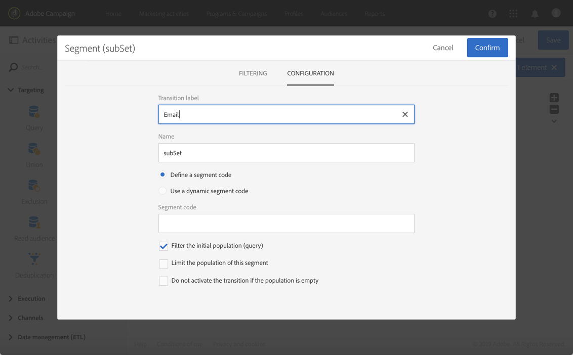 을(를) 사용해야 합니다 세그먼테이션 활동으로 쿼리에서 업스트림 계산된 모집단에서 하나 또는 여러 세그먼트를 만듭니다.