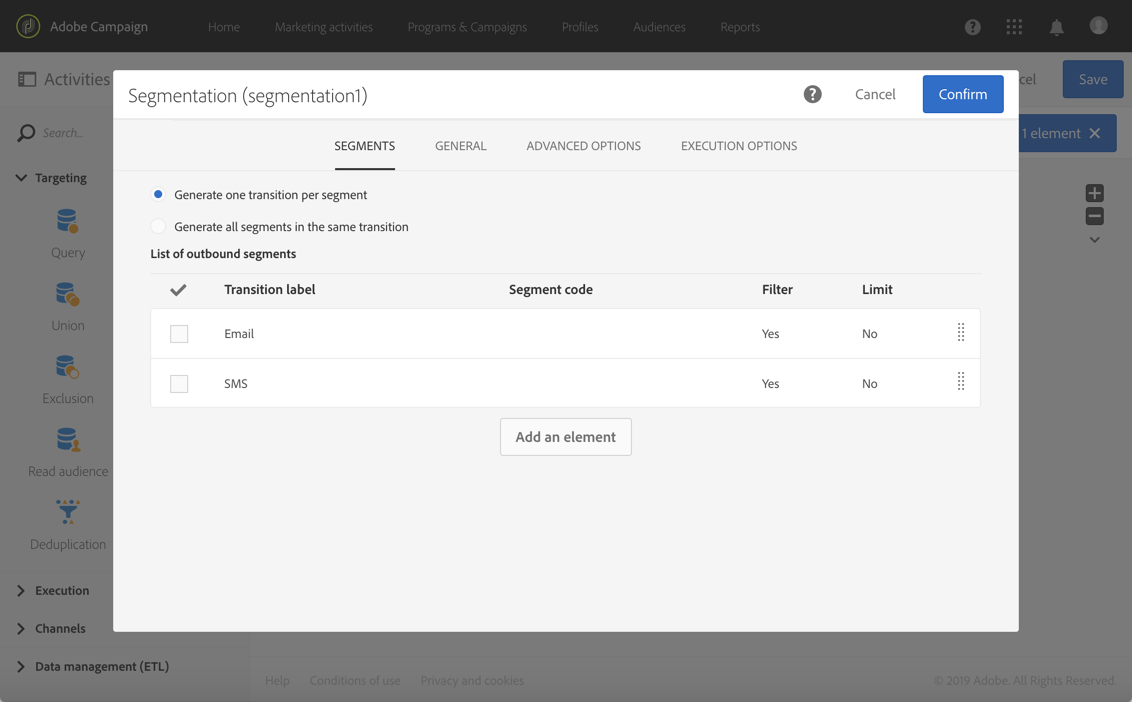 두 개의 전환이 이미 만들어졌으므로 이제 두 가지 유형의 게재를 세분화 활동의 아웃바운드 전환에 추가해야 합니다. an 이메일 게재 활동 및 SMS 게재 활동.