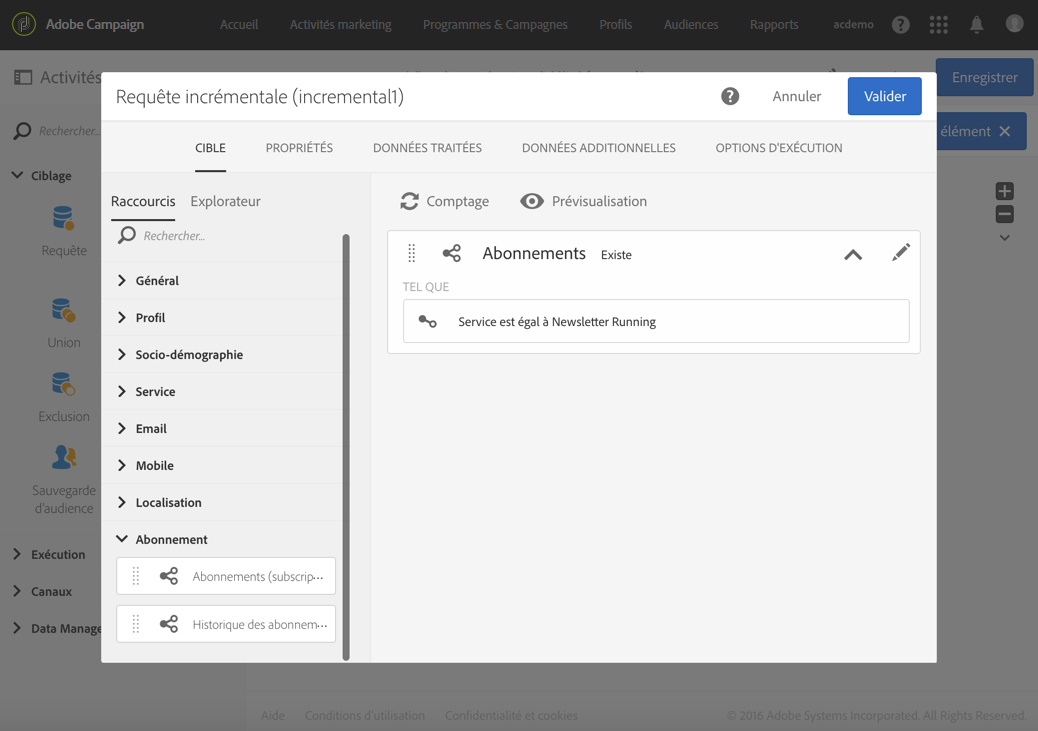 L’exemple ci-après illustre le paramétrage d’une activité de Requête incrémentale visant à filtrer les profils de la base Adobe Campaign qui sont abonnés au service Newsletter Running, afin de leur envoyer un email de bienvenue contenant un code promotion.