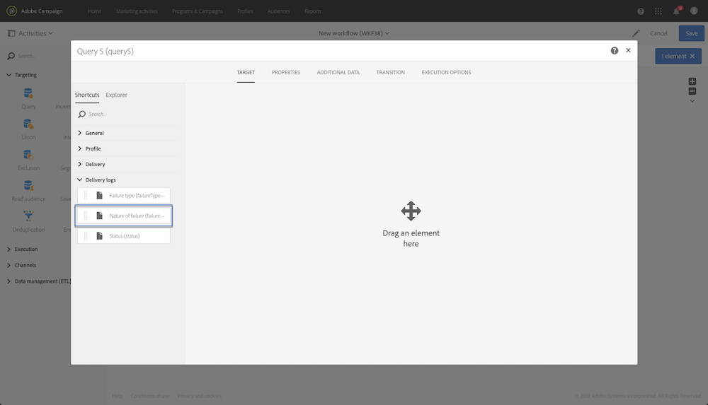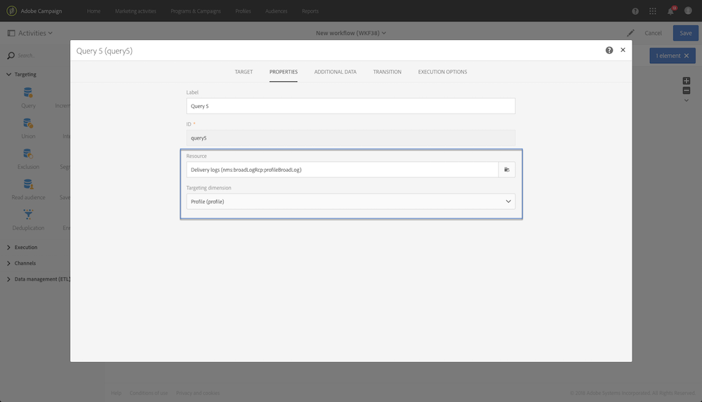 El siguiente ejemplo muestra una actividad de consulta configurada para filtrar perfiles para los que los envíos fallaron porque el buzón estaba lleno. Esta consulta solo está disponible para usuarios con derechos de administración y pertenecientes a las unidades organizativas All (all) (consulte esta sección).