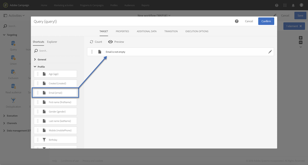 다음 예제에서는 이메일 주소를 제공한 프로필을 타겟으로 구성한 쿼리 활동을 보여줍니다.