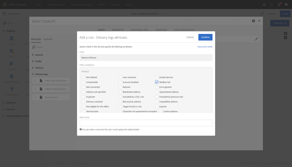타겟팅할 실패 유형을 선택합니다. 이 예제에서는 Mailbox full입니다.
