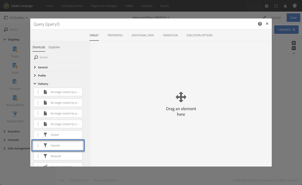 다음 예제에서는 이메일 주소 도메인이 "orange.co.uk"인 프로필을 타겟으로 구성한 쿼리 활동을 보여줍니다.