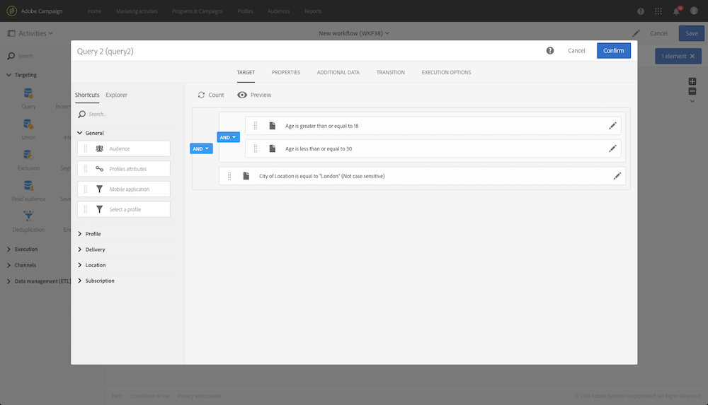 下列範例顯示一個查詢活動,其設定是針對居住在倫敦年齡介於 18 至 30 的歲男性。