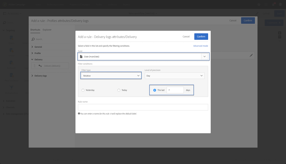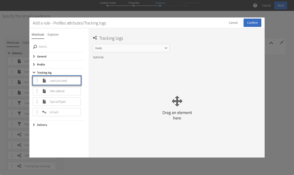 在下拉式清單中選取 Does not exist,然後拖曳 Delivery 篩選器。