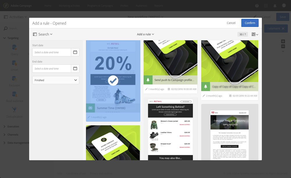 下列範例顯示一個查詢活動,其設定為篩選開啟傳送且標籤為 "Summer Time" 的輪廓。