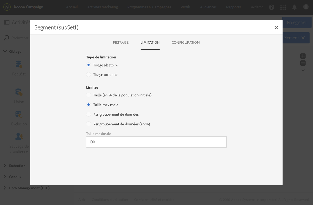 une limitation de type Tirage aléatoire associé à une limite de Taille maximale avec pour valeur 100.