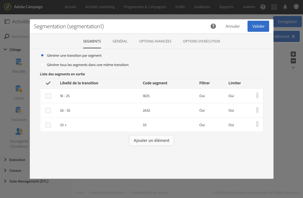 Une activité Segmentation permettant de créer trois segments répartis dans des transitions sortantes différentes : 18 - 25 ans, 26 - 32 ans et plus de 32 ans. Les segments sont définis selon les paramètres suivants :