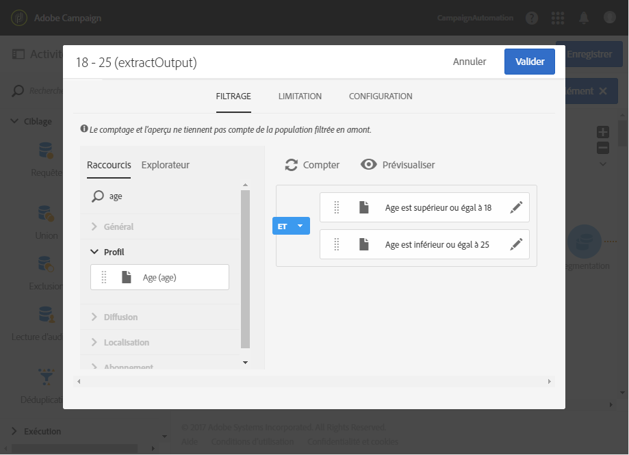 un filtrage sur l'âge permettant de définir la tranche d'âge du segment
