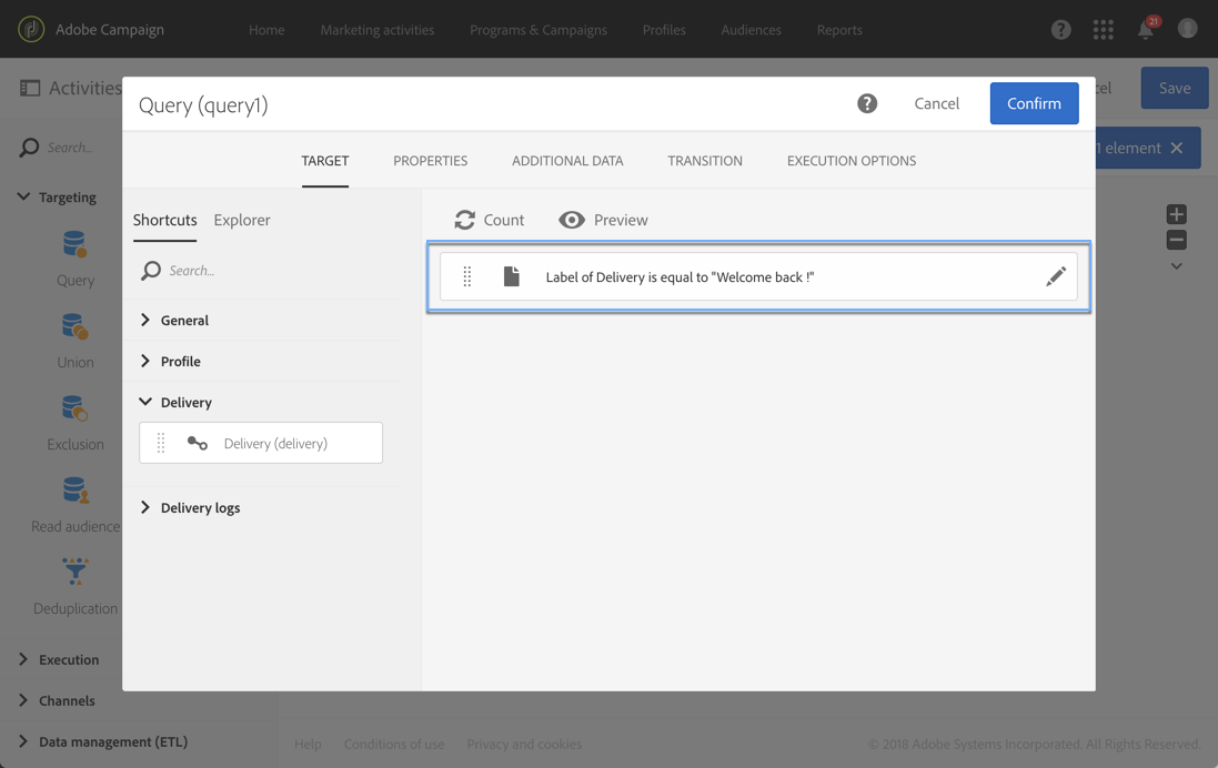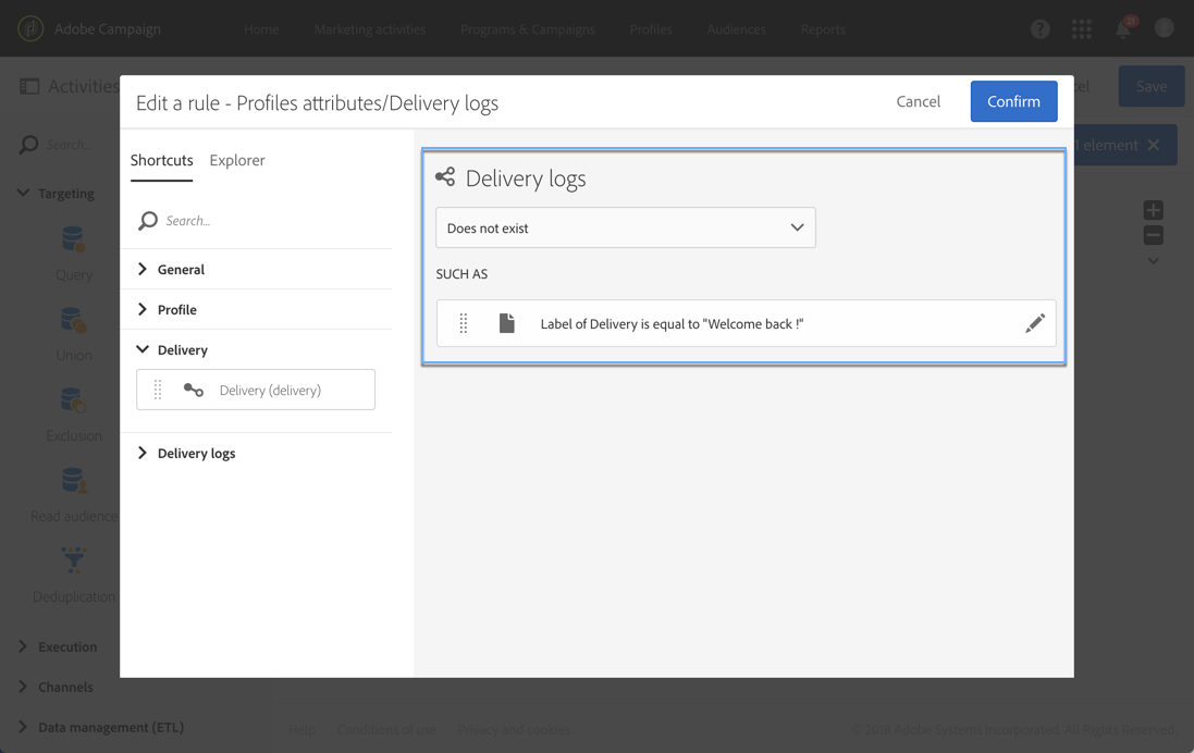 예제 1: "Welcome back !"이라는 레이블이 있는 게재가 타겟팅한 프로필 확인.