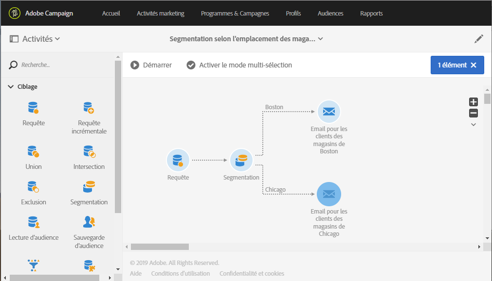 pour créer un segment ciblant les personnes dans la deuxième ville. Ici, Toulouse.Dans Activités > Canaux, effectuez un glisser-déposer d’une activité Diffusion Email après chaque segment.