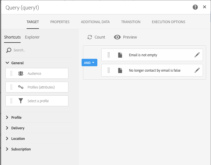 - Shortcuts에서 Profiles을(를) 끌어다 놓고 is not empty 연산자가 있는 email 필드를 선택합니다 .