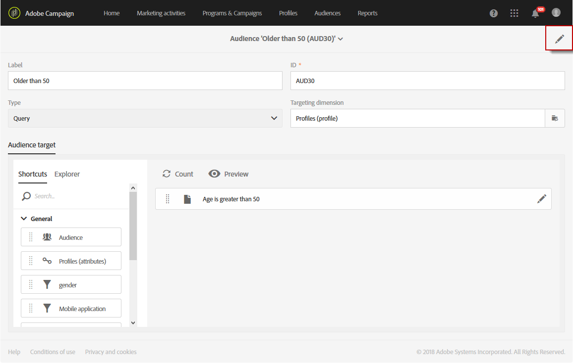 대상자 모집단을 정의하는 쿼리를 만듭니다. 쿼리 편집 섹션을 참조하십시오.