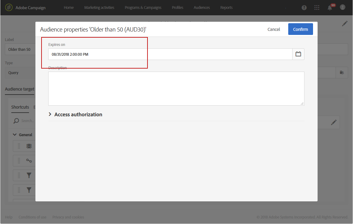 Expires on 필드에서 대상자에 대해 만료 날짜를 추가합니다.