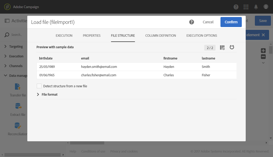 끌어다 놓은 뒤 Load file 활동을 구성하면 활동 실행 시 알 수 없는 차원이 있는 모집단을 가져올 수 있습니다. 이 활동 구성에 대한 자세한 내용은 파일 로드 섹션을 참조하십시오.