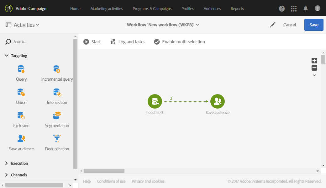 Save audience 활동을 Load file 활동 뒤에 끌어다 놓습니다. 이 활동 구성에 대한 자세한 내용은 대상자 저장 섹션을 참조하십시오.
