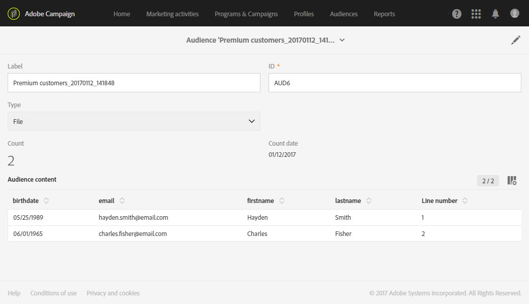 Experience Cloud 대상자를 편집하려면 People 핵심 서비스로 대상자 가져오기/내보내기 섹션을 참조하십시오.