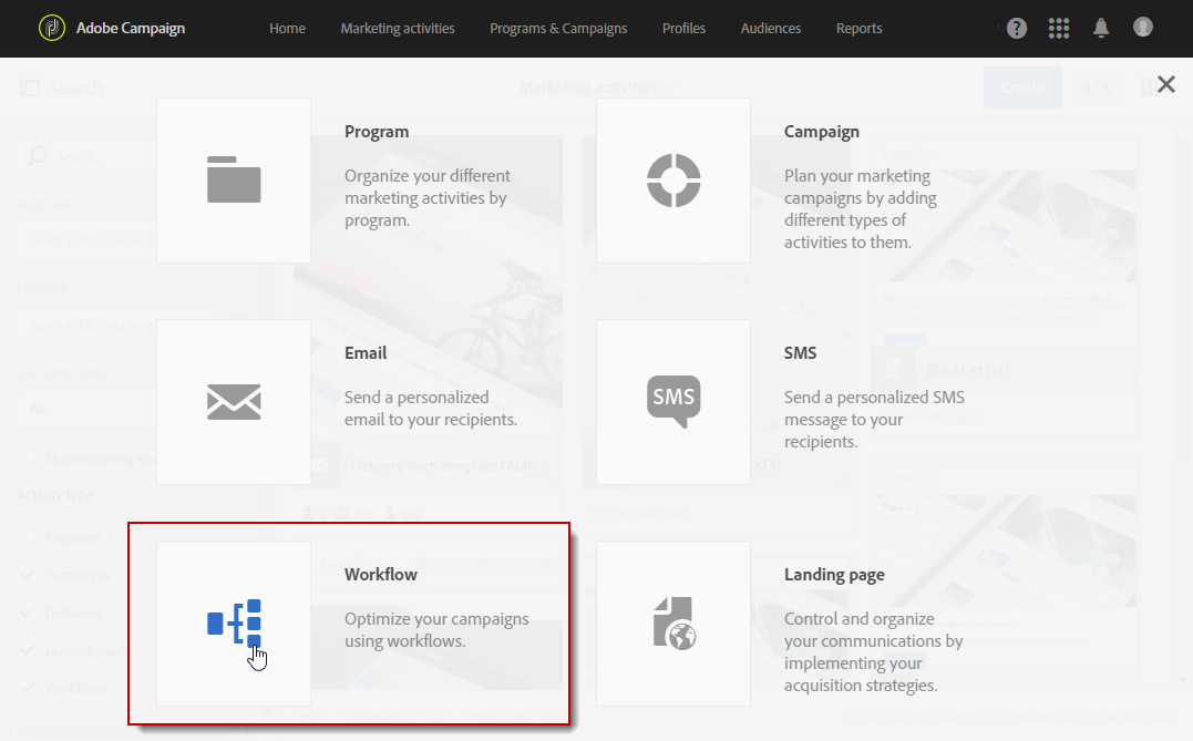 마케팅 활동 탭에서 만들기를 클릭하고 워크플로우를 선택합니다.