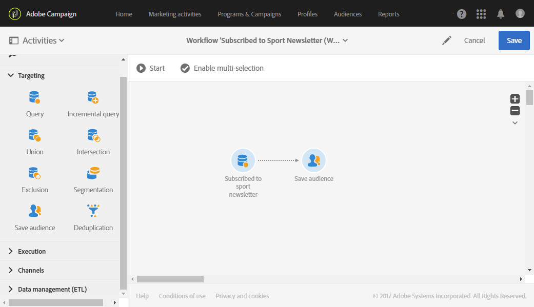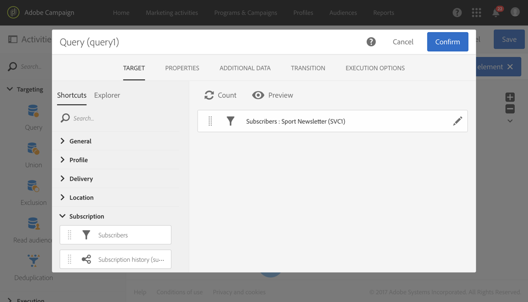 Query 활동을 사용하거나, Load file 활동을 사용하여 데이터를 가져온 뒤 Reconciliation 활동을 사용하여 가져온 데이터의 차원을 확인할 수 있습니다. 여기서는 Query 활동으로 스포츠 뉴스레터를 구독한 수신자를 타겟팅하려고 합니다.