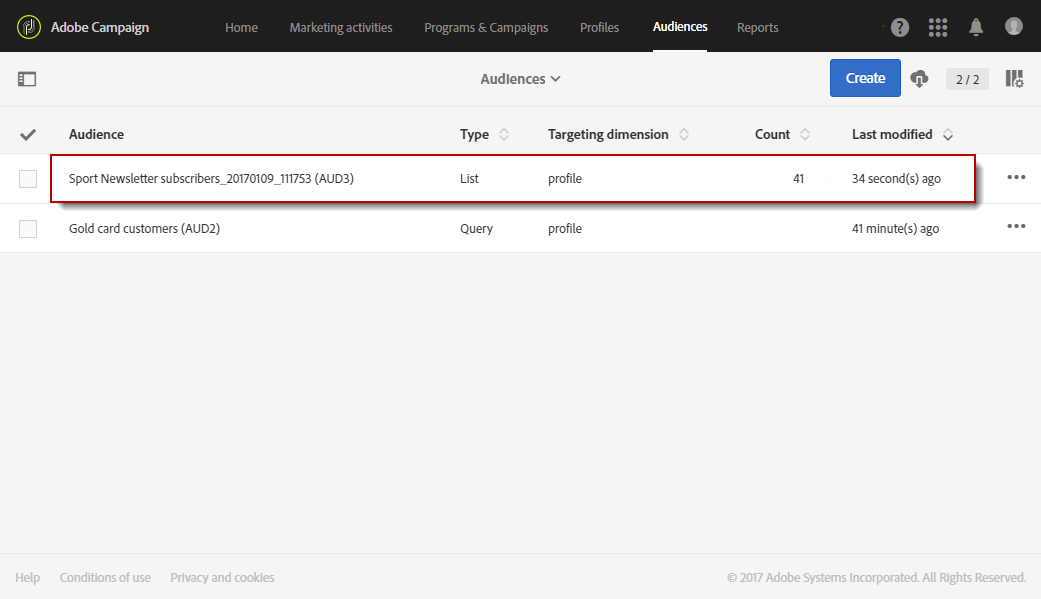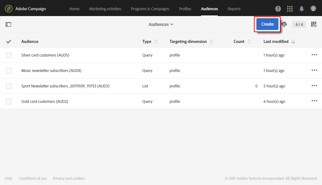 대상자 목록에서 Adobe Campaign 프로필에 대한 쿼리를 수행하거나 Adobe Experience Cloud 대상자를 가져와 대상자를 만들 수 있습니다.