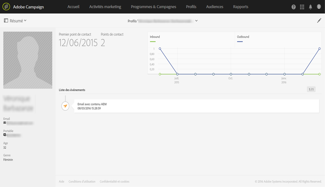Adobe Campaign vous permet de gérer des contacts dans toutes les étapes de leur cycle de vie : création, import, ciblage, tracking des actions, mise à jour, etc. Les contacts sont stockés dans la base de données sous forme de profils regroupant les informations qui leur sont attachées : nom, prénom, coordonnées, abonnements, diffusions, etc.