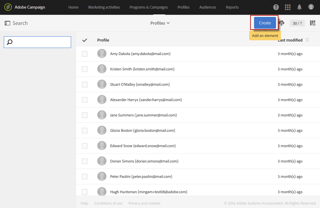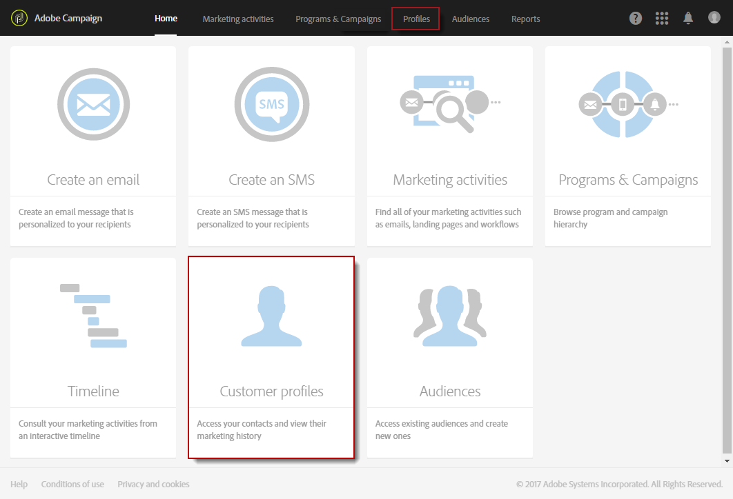 Na home page do Adobe Campaign, clique no cartão Customer Profiles ou na guia Profiles para acessar a lista de perfis.
