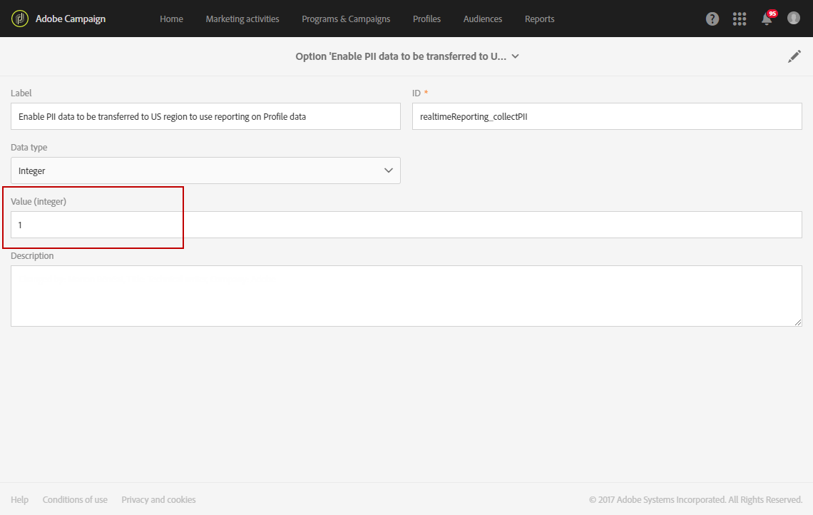 Esta opción no es final, siempre puede cambiarla seleccionando Enable PII data to be transferred to US region to use reporting on Profile data en Administration > Application Settings > Options.