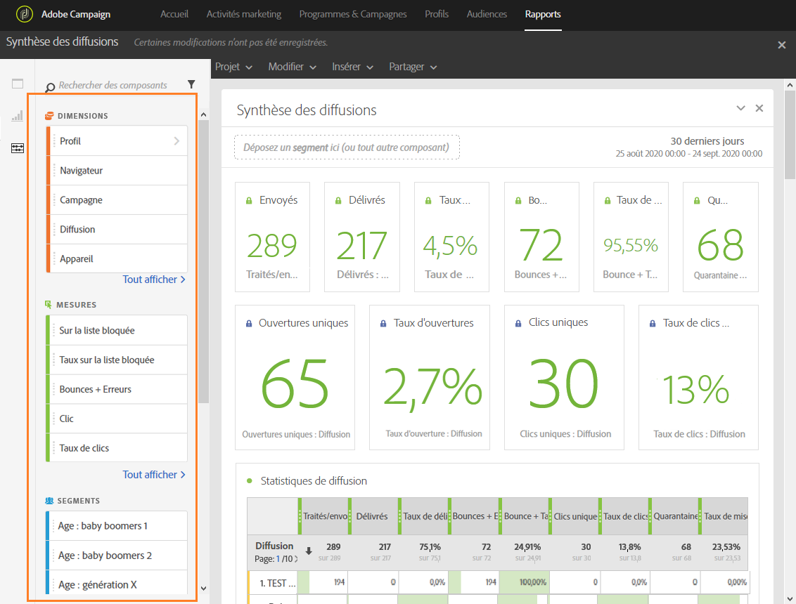 Cette catégorie est disponible uniquement lorsque l'administrateur a accepté les conditions générales de l'accord sur l'utilisation des rapports dynamiques qui s'affiche à l'écran. Si l'administrateur refuse les conditions générales de l'accord, les segments ne sont pas visibles dans l'onglet Composants et les données ne sont pas collectées.
