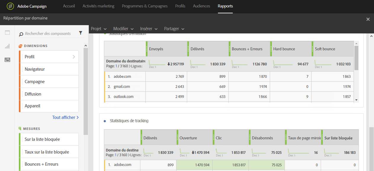 Ce rapport contient les données de performance pour chaque domaine représenté dans l'audience pour une diffusion email. S'il s'agit d'un rapport de campagne ou de programme, les données de performance sont disponibles pour des audiences multiples. Ces données vous permettent d'analyser le comportement de chaque domaine par rapport à des événements spécifiques. Par exemple l’affichage de liens, le placement d’URL sur la liste bloquée, etc.