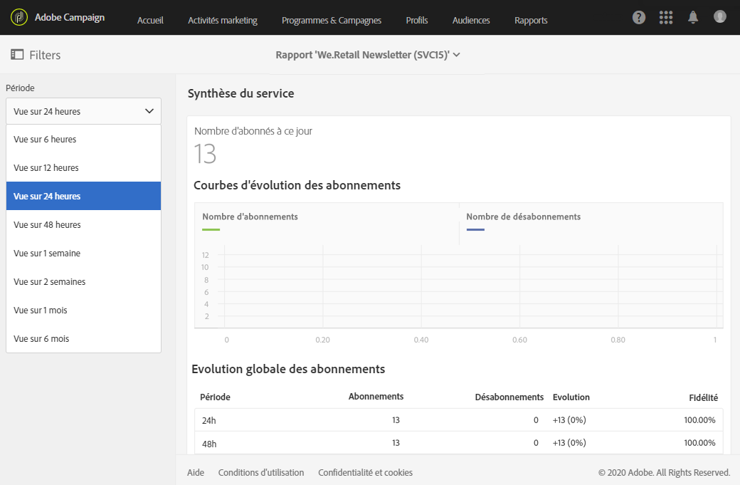 Le rapport Synthèse du service présente en détail l’évolution des abonnements et des désabonnements de votre service.