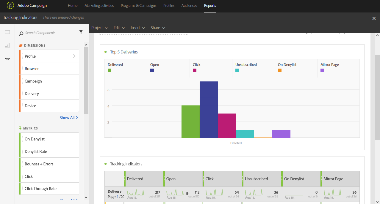 다음 Tracking indicators 테이블 및 상위 5개 게재 그래프에는 다음과 같이 이메일 추적에 사용할 수 있는 데이터가 포함되어 있습니다.