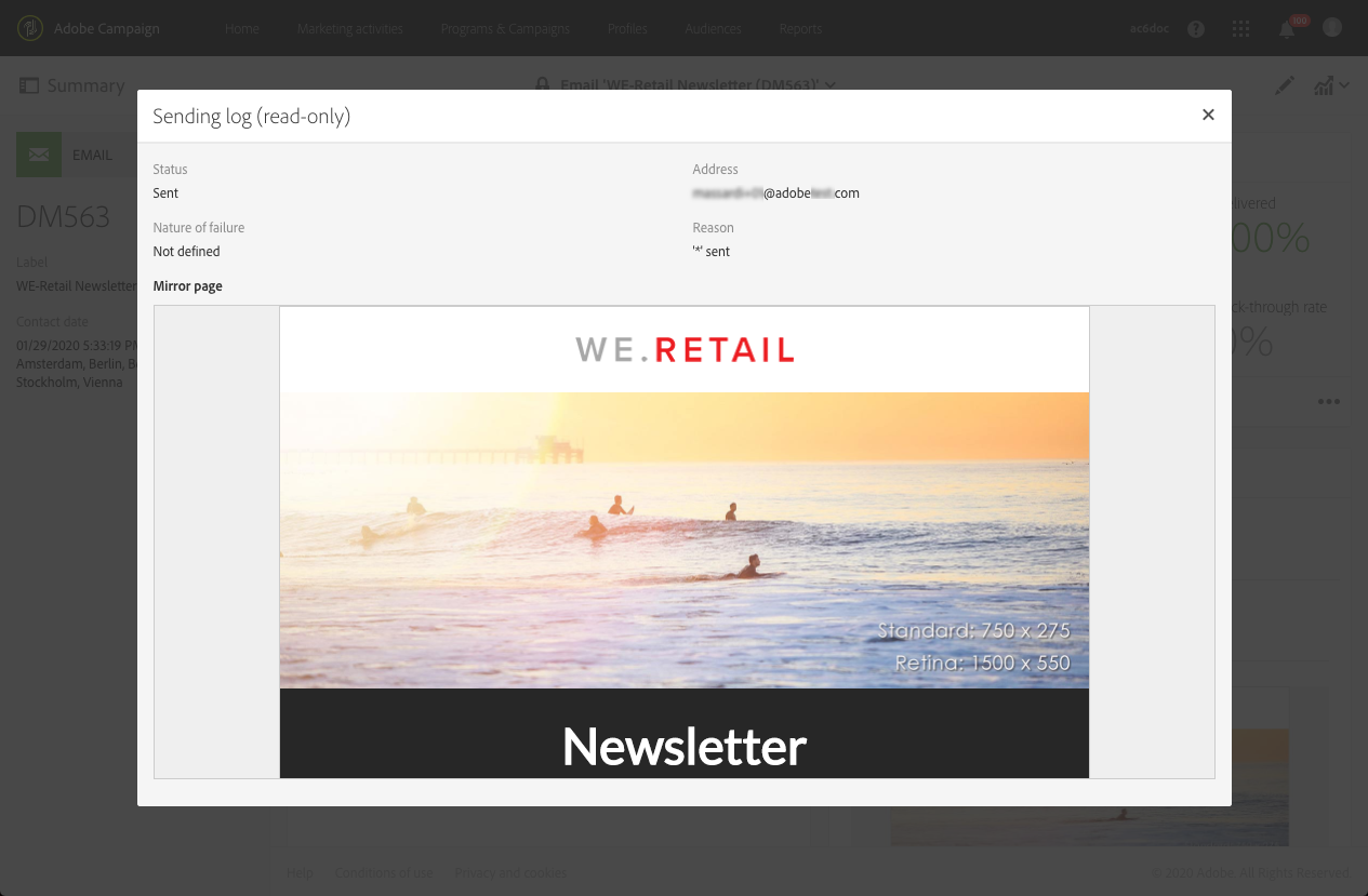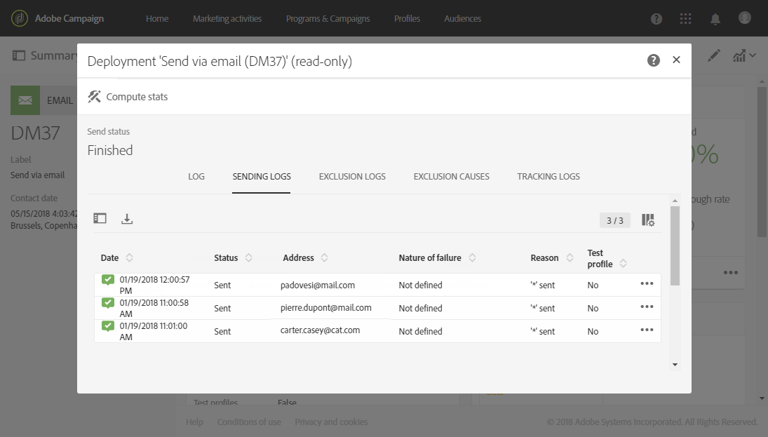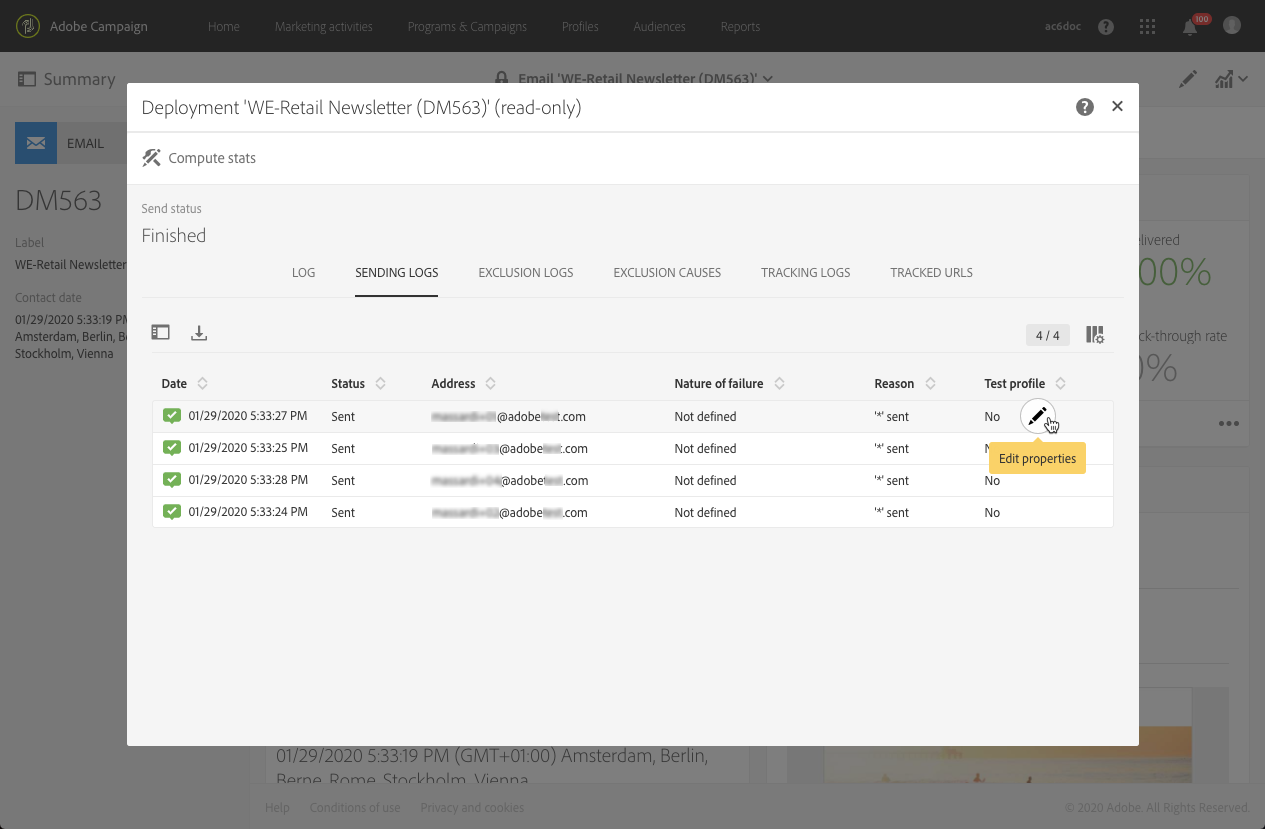Sending logs 탭에는 이 게재의 모든 발생 내역이 표시됩니다. 보낸 메시지 및 상태 목록이 여기에 저장됩니다. 여기에서 각 수신자에 대한 게재 상태를 볼 수 있습니다.