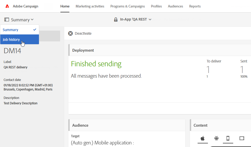 작업 로그: Summary 드롭다운 목록에서 Job history 을(를) 선택하여 메시지 대시보드에서 게재에 의해 트리거된 일괄 처리 작업 목록에 액세스할 수 있습니다.